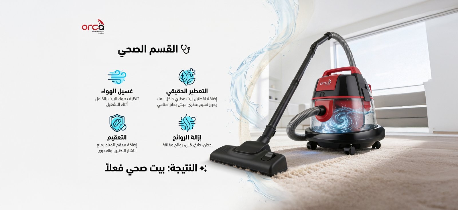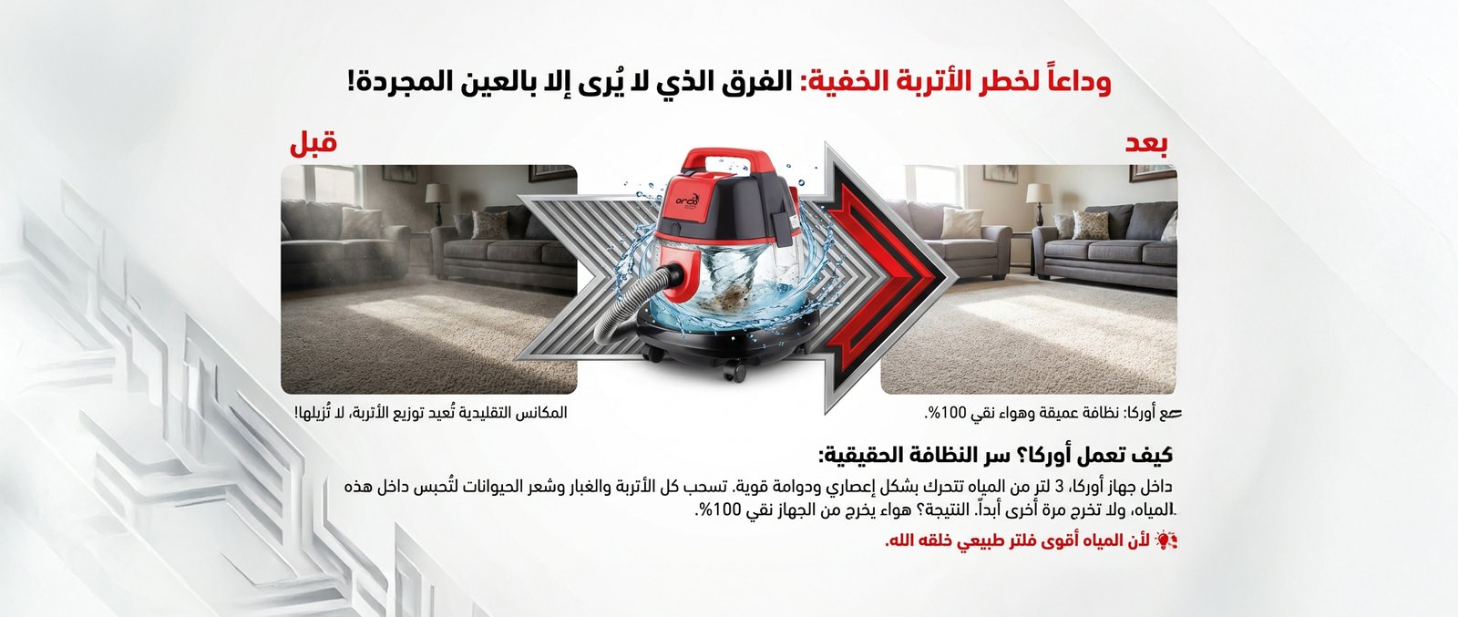 قسم التنظيف الجاف في أوركا يمنحك قوة شفط عميقة تصل إلى أدق الجزيئات داخل السجاد والمراتب والانتريهات والأرضيات، مع نظام بدون أكياس يعتمد فقط على الماء لاحتجاز الأوساخ نهائيًا دون إعادة نشرها أو تكاليف استبدال مستمرة.