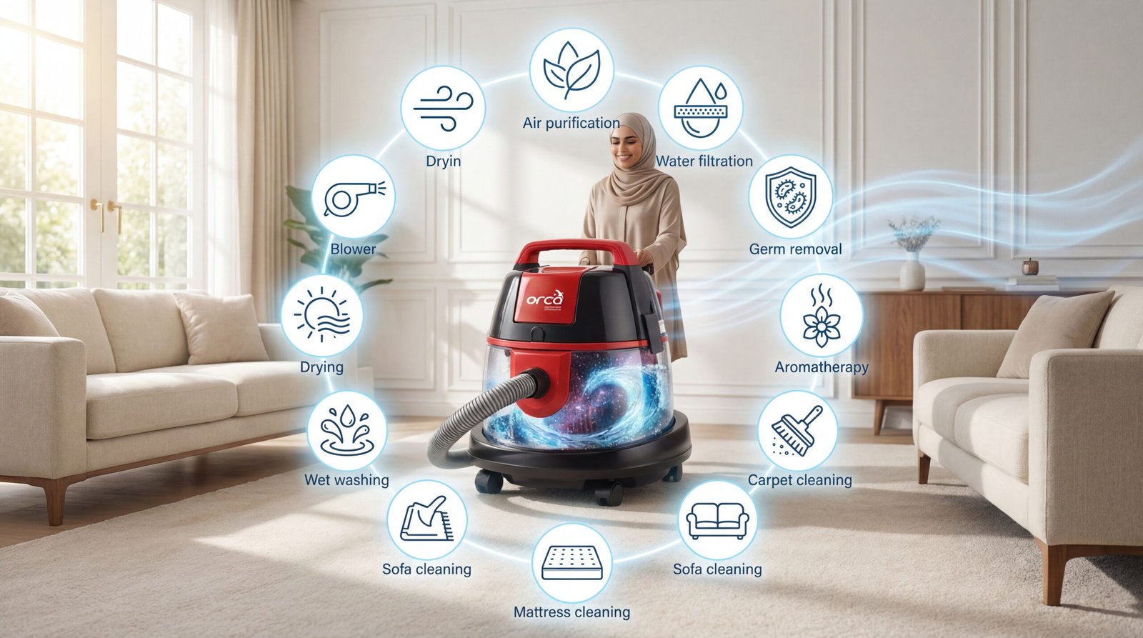 في قسم التنظيف الجاف من أوركا، أنتِ لا تحصلين على مجرد شفط عادي للغبار، بل على نظام تنظيف عميق يعتمد على قوة شفط عالية مدعومة بتقنية الفلترة بالماء، مما يضمن سحب الأتربة الدقيقة، وشعر الحيوانات، وبقايا الغبار العالقة داخل الأنسجة وليس فقط على السطح. سواء كان تنظيف السجاد، الانتريهات، المراتب أو الأرضيات، يعمل الجهاز بكفاءة متكاملة ليصل إلى أدق الجزيئات التي لا تراها العين المجردة. والأهم من ذلك، أن التصميم بدون أكياس يعني وداعًا لمصاريف الاستبدال المستمرة ومشاكل انسداد الأكياس أو تسريب الأتربة مرة أخرى. كل ما تحتاجينه هو ماء نظيف داخل الخزان، وبعد الانتهاء يتم التخلص من المياه المتسخة بسهولة واستبدالها، دون فوضى أو استهلاك إضافي. النتيجة؟ تنظيف أعمق، تكلفة أقل على المدى الطويل، وراحة أكبر مع كل استخدام.